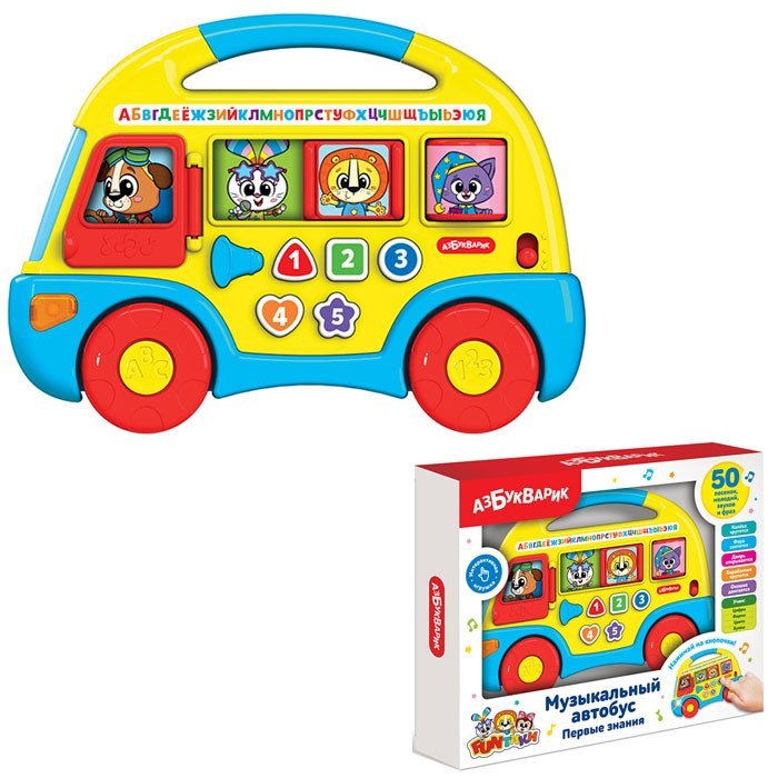 Необычная музыкальная игрушка «Автобус» от «Азбукварик» удивит вашего малыша! Нажимая на цветные и мигающие кнопочки, малыш сможет послушать известные детские песенки («Чижик-пыжик», «Чунга-чанга», «Веселый автобус» и др.), сможет выучить формы и цвета. Автобус можно катать на колесиках, а также открывать дверь и окошко. Отличный подарок ребенку на любой праздник!