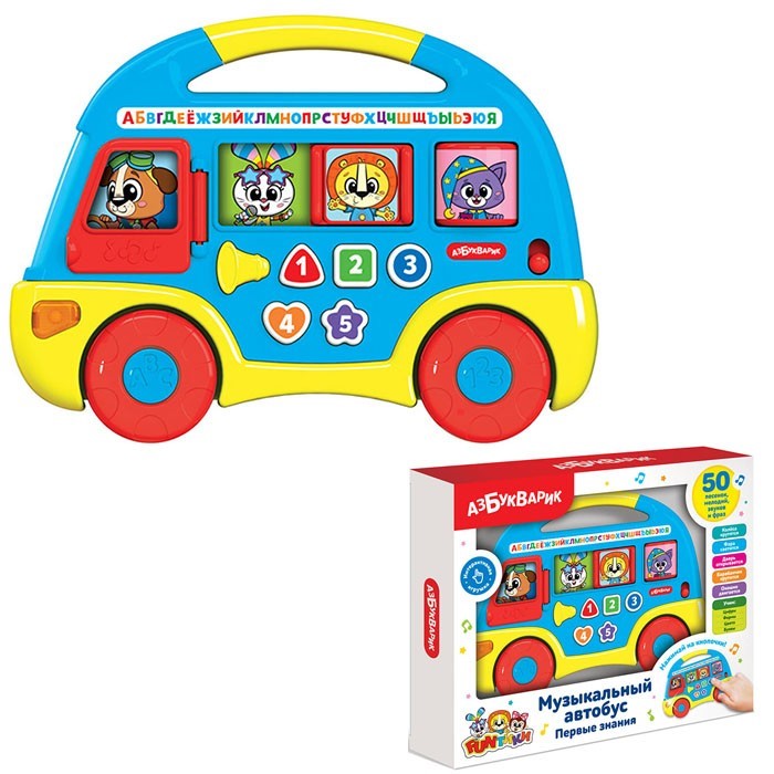 Необычная музыкальная игрушка «Автобус» от «Азбукварик» удивит вашего малыша! Нажимая на цветные и мигающие кнопочки, малыш сможет послушать известные детские песенки («Чижик-пыжик», «Чунга-чанга», «Веселый автобус» и др.), сможет выучить геометрические формы и цвета. Автобус можно катать на колесиках, а также открывать дверь и окошко. Отличный полезный подарок ребенку на любой праздник!