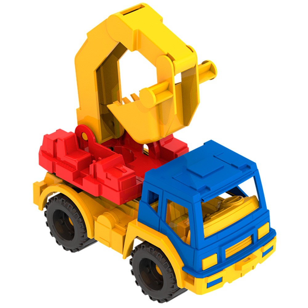 Яркая модель представляет собой копию экскаватора с подъемным ковшом.