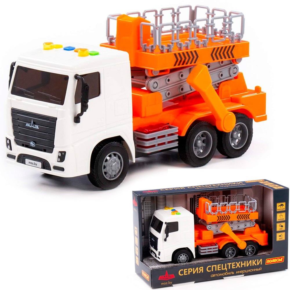 Автомобиль МАЗ с подъёмником инерционный со светом и звуком в коробке 94025 П-Е /8/
