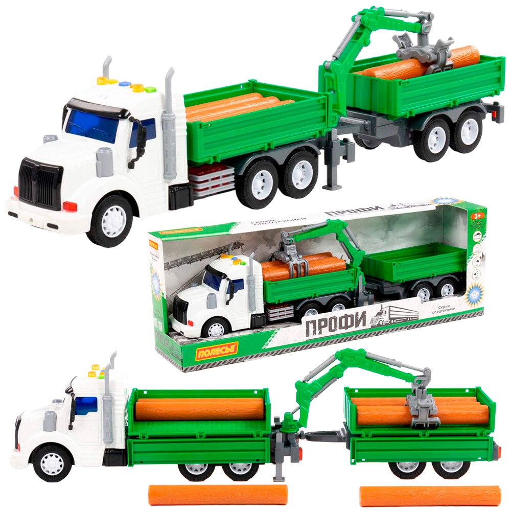 Комплектация: автомобиль бортовой с манипулятором, прицеп, древесные заготовки (6 шт.)