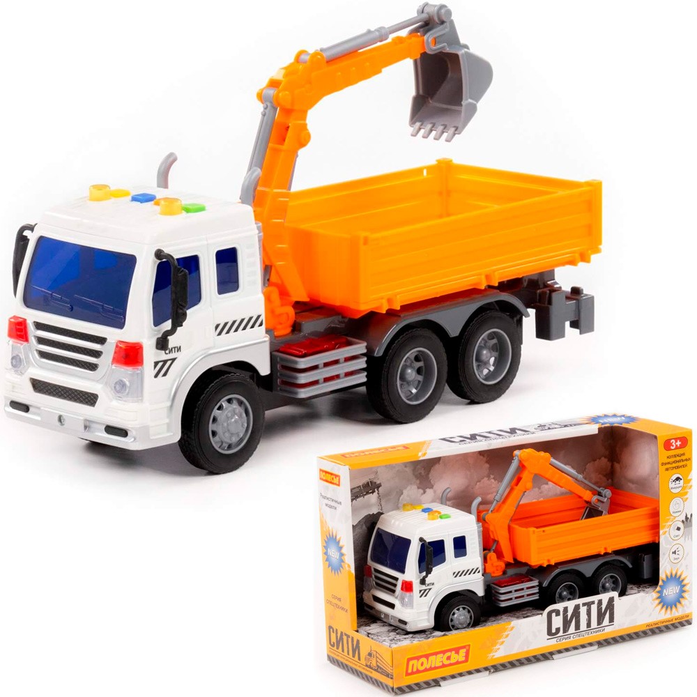 Реалистичный грузовик-экскаватор Сити с ковшом-манипулятором по достоинству оценят коллекционеры и любители спецтехники.