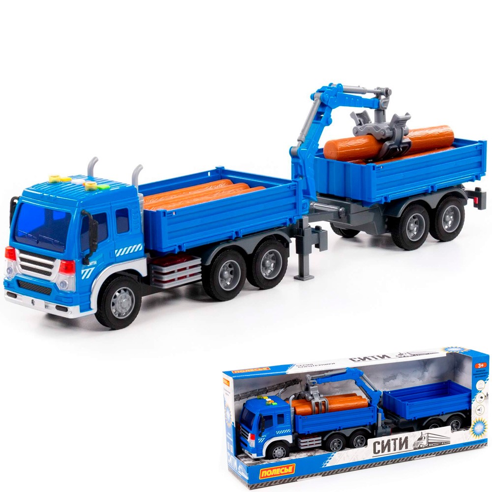 Автомобиль Сити бортовой с манипулятором и прицепом инерционный со светом и звуком синий в коробке 96036 П-Е /4/