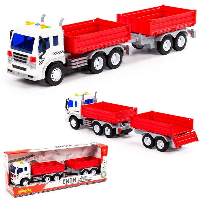 Автомобиль Сити бортовой с прицепом инерционный со светом и звуком красный в коробке 93110 П-Е /4/