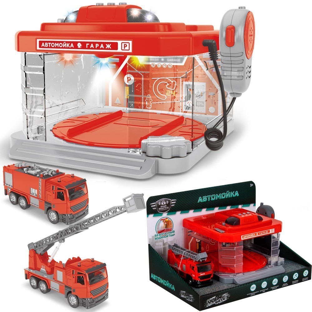 Функционал: инерционный механизм, тематический набор, пожарная автомойка, свет, пар