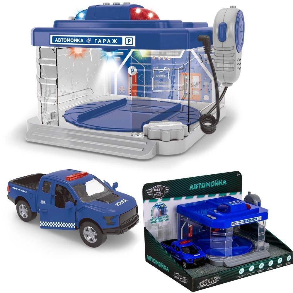 Функционал: инерционный механизм, тематический набор, полицейская автомойка, свет, пар