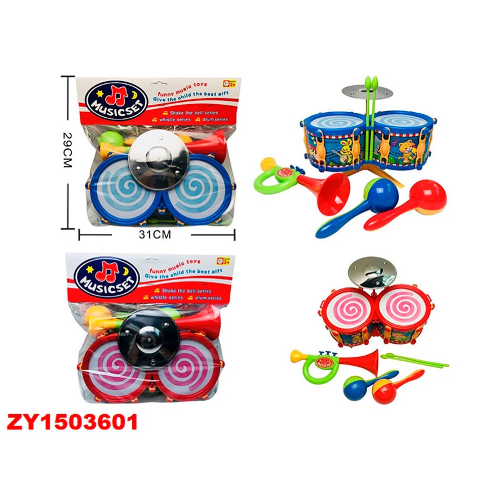 Комплектация: барабанная установка (2 барабана, 2 палочки, 1 тарелка, подставка) - 1 шт., дудочка - 1 шт., маракас - 2 шт.