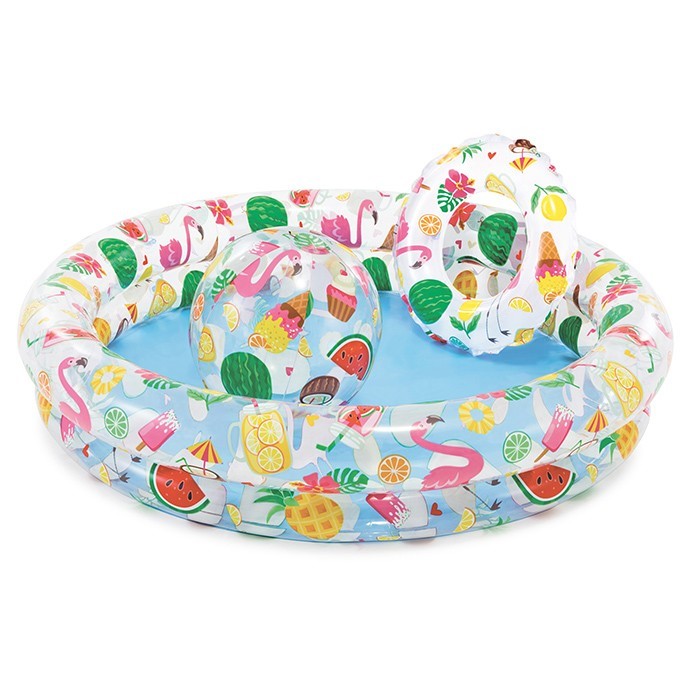 Бассейн яркой расцветки предназначен для малышей от года. Может использоваться как для воды, так и в качестве сухого бассейна. Состоит из трех надувных колец. Изготовлен из высококачественного винила толщиной 0,25 мм, устойчивый, надежный и безопасный. Имеет мягкие стенки с широкими бортиками и прочное дно. Бассейн легко надувается и устанавливается на любой ровной поверхности. На холодное время года не рекомендуем оставлять бассейн на открытом воздухе. Круг для плавания и большой надувной мяч дополнят игры и разнообразят досуг.