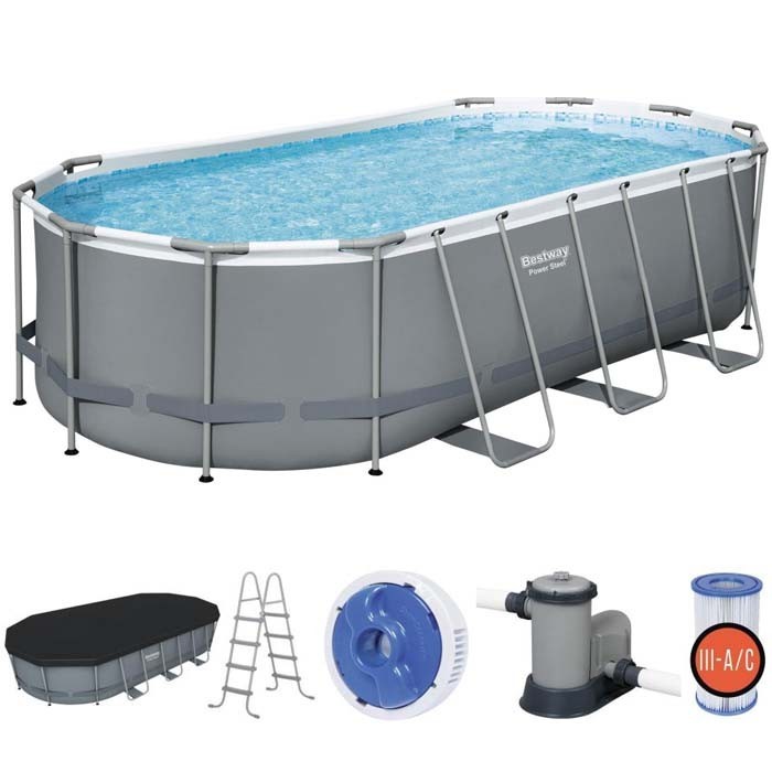 Комплектация: каркасный бассейн, картриджный фильтр-насос 5678 л/ч, лестница (122 см), поплавок-дозатор, тент, инструкция