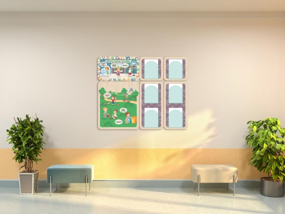 Информационный стенд 1 шт. (размер на выбор: 100.5 х 74 см / 100.5 х 111 см / 137.5 х 111 см)Стенды выполнены из качественной берёзовой фанеры, сверху нанесена UF-печать стойкими к выцветанию красками без запаха. Крепления надёжно спрятаны, углы конструкции скруглены для уменьшения травматизма. Изделие легко подвергается сухой и влажной уборке.