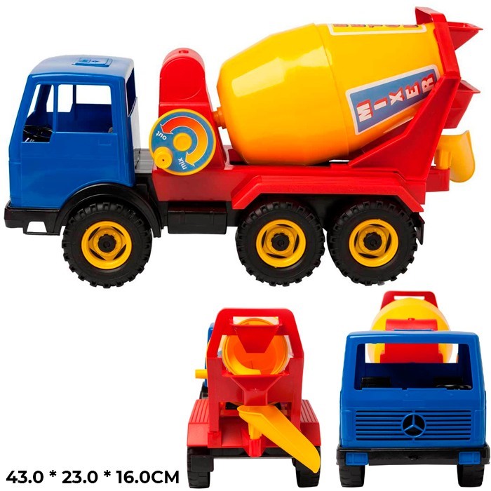 Бетоносмеситель наверняка понравится маленьким любителям спецтехники. Тем более, что барабан можно покрутить с помощью специальной рукоятки, расположенной за кабиной. Бетоносмеситель "Мерседес" имеет длину 43 см. У него 6 колес. В кабине – сиденья и руль. На кабине наклейки. Упакован в полиэтиленовый пакет.