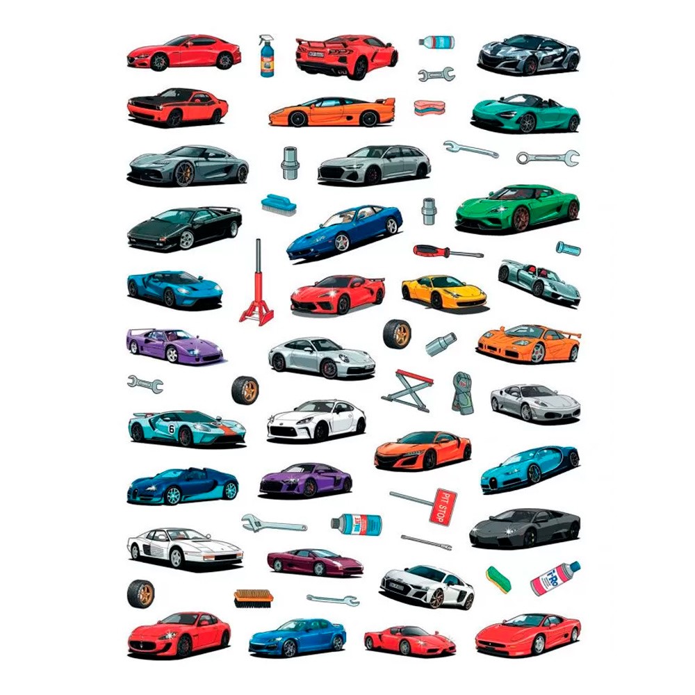 - множество наклеек с изображениями самых крутых и популярных автомобилей XX и XXI века! Также внутри вы найдёте 6 интересных локаций, куда можно наклеить стикеры и заполнить автомобилями любимых марок гоночный трек, автосервис или даже целый городской квартал!