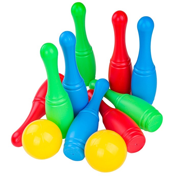 состав набора: 9 кеглей (высота - 22 см), 2 маленьких мяча (диаметр - 9 см)