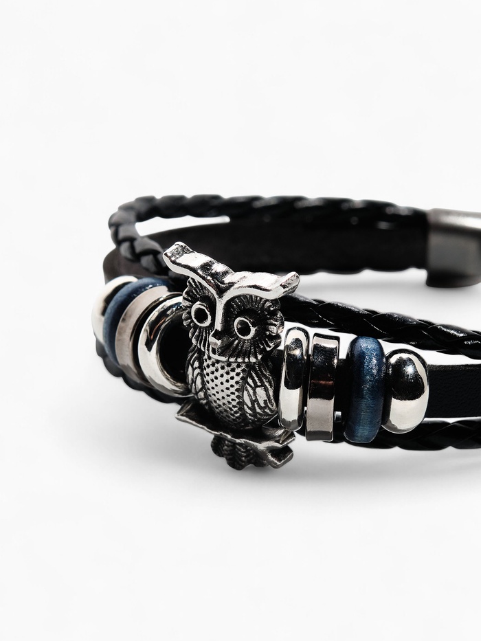 Браслет кожа «Совушка», чёрный в серебре, L=20 см