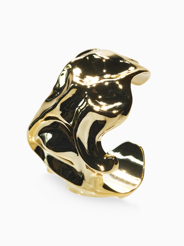 Золотистая лавовая волна на вашем запястье Манжетный женский браслет золотистого оттенка – изящный элемент декора, созданный специально для тех, кто ценит выразительность минимализма. Его простая форма подчеркивает природную красоту и тонкость линии, превращаясь в идеальный компаньон вашему образу.