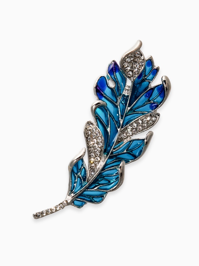 Брошь "Перо" прозрачное, цвет сине-голубой в серебре