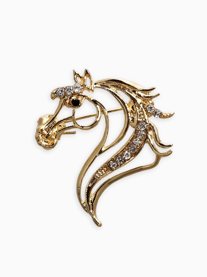 Благородство конского профиля в золотом ореоле Женская брошь с белой лошадью – очаровательный аксессуар, пропитанный философией мудрости и власти животных. Исключительно красивая форма украшения стала результатом кропотливой работы мастеров, воплотивших силу и красоту лошади в ювелирном изделии.