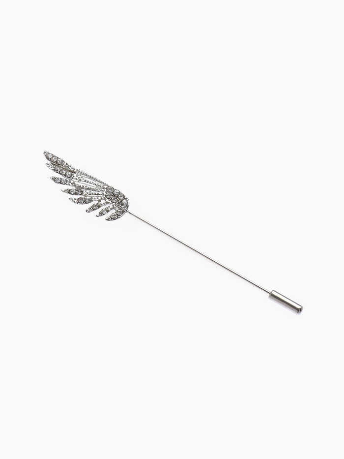 Эта изящная булавка длиной 9 см воплощает лёгкость и свободу, символизируемые крыльями. Выполненная из прочного металла с серебристым покрытием, она украшена белыми стразами, которые придают изделию утончённое сияние и элегантность.