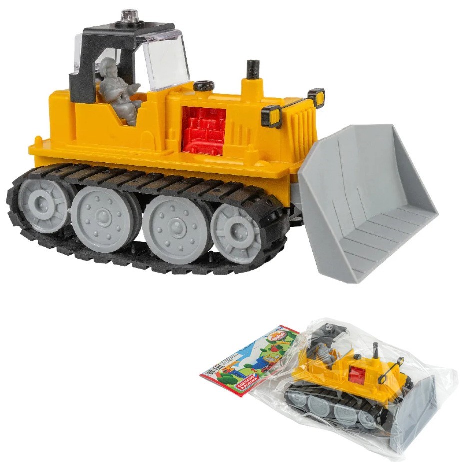 Бульдозер на гусеничном ходу будет интересен ребенку хорошей детализацией и подвижным ковшом - если нажать на трубу, то ковш поднимется. В кабине бульдозера находится небольшая фигурка водителя, что придаст еще больше реалистичности игре. Бульдозер выполнен качественно, из безопасных нетоксичных материалов, не имеет острых краев и зазубрин. Цвета представлены в ассортименте.