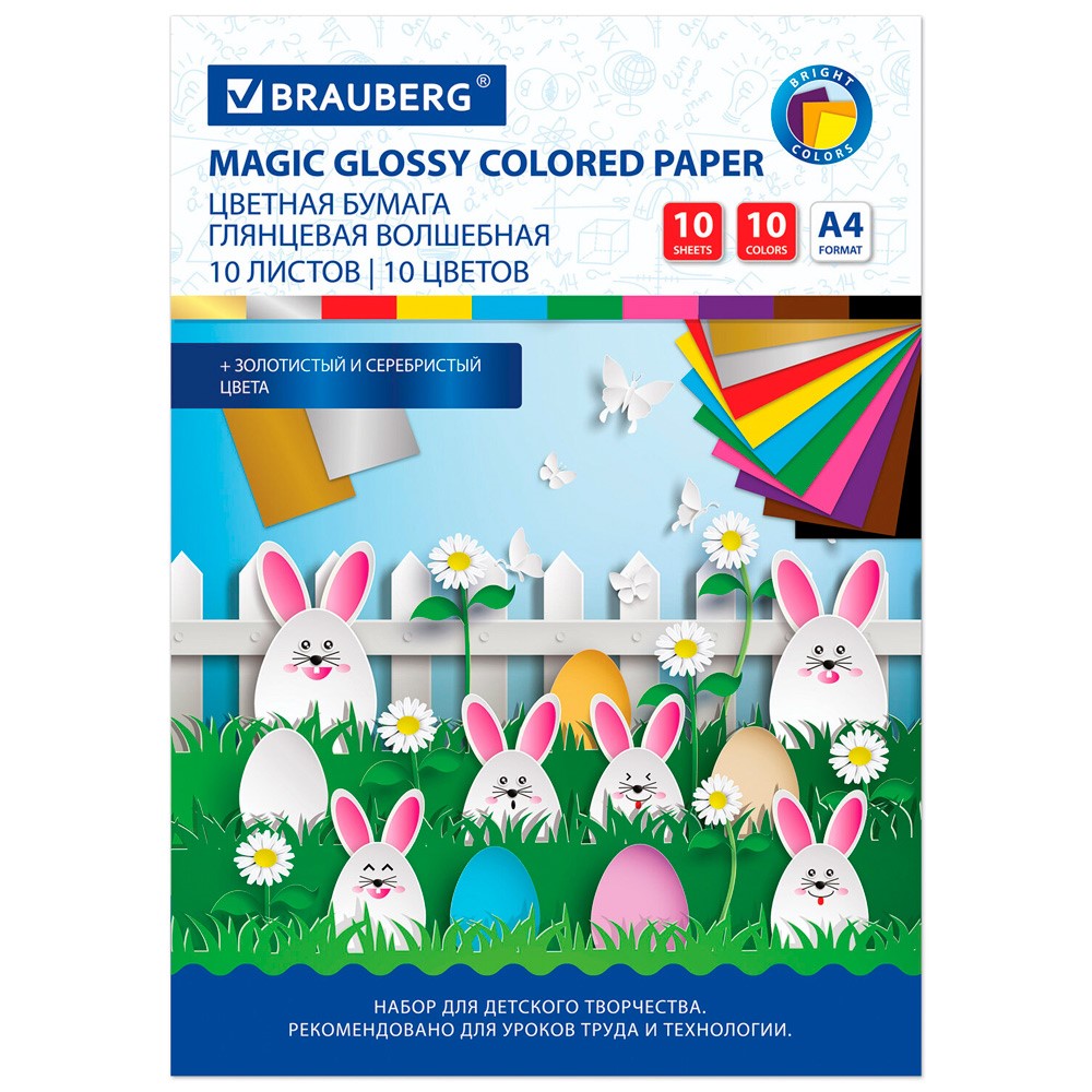 Бумага цвет. 10 л. 10 цв. А4 мелованная ВОЛШЕБНАЯ BRAUBERG, 200х275мм Зайцы 129926