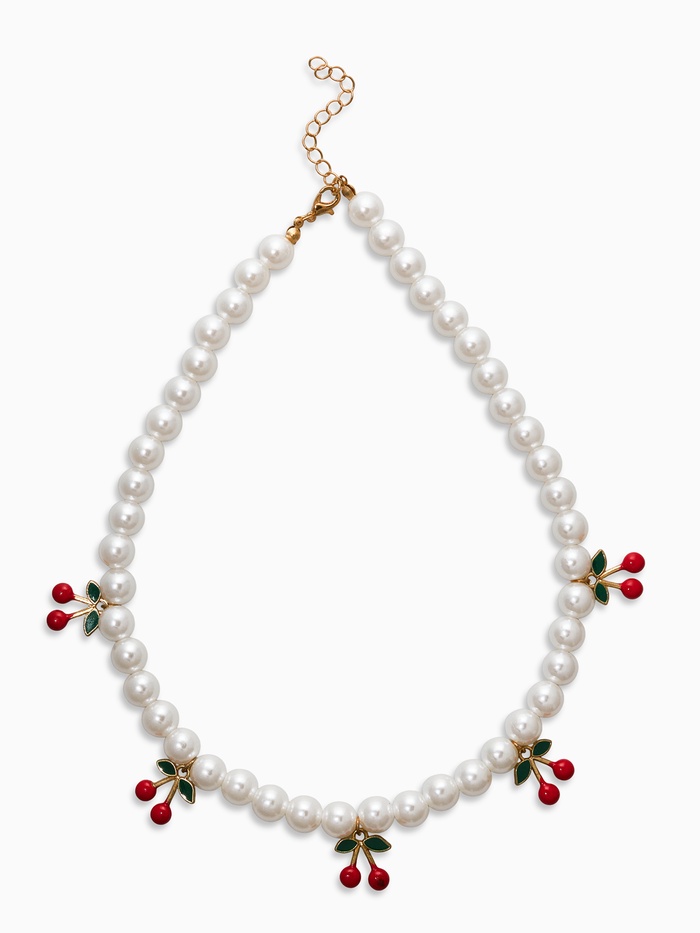 - Богатая композиция: сочетание белого жемчуга и алых декоративных деталей в форме вишни дарит особую глубину восприятия и привлекает внимание к линии шеи.