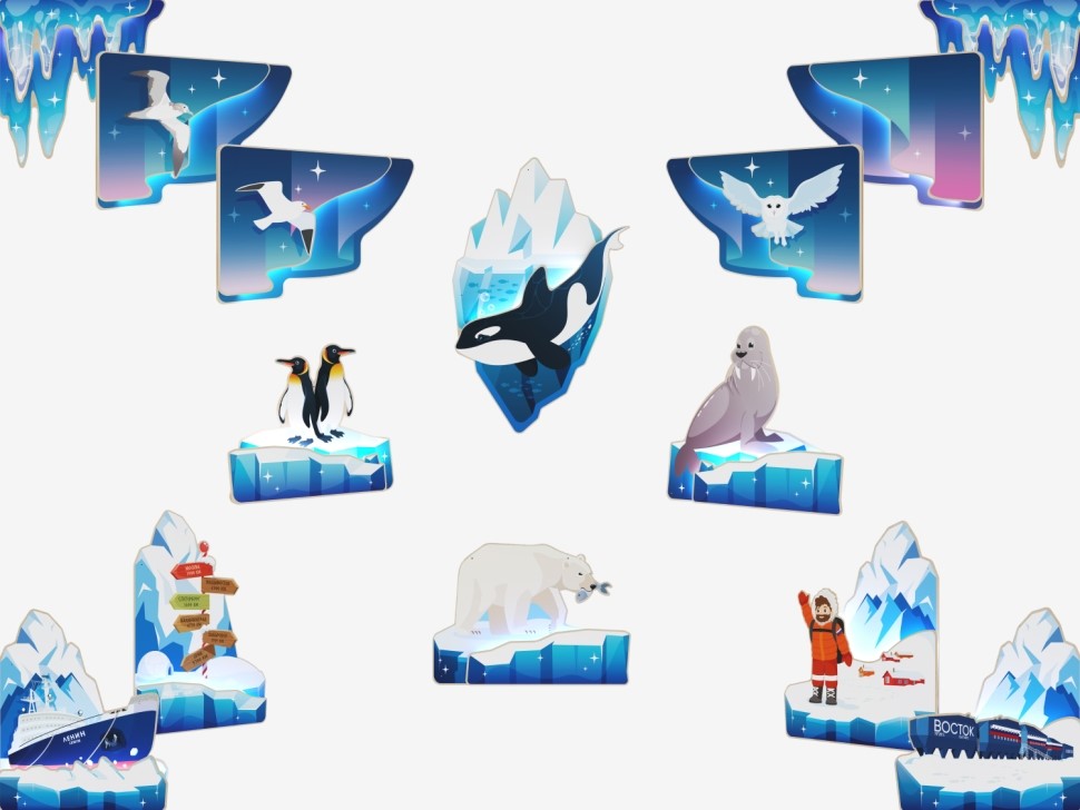 Набор декоративных настенных панелей «Арктика и Антарктика» создает атмосферу настоящего полярного путешествия в образовательном пространстве. Это тематическое решение идеально подходит для оформления стен в детских садах, школах, центрах дополнительного образования, а также игровых зонах общественных мест.