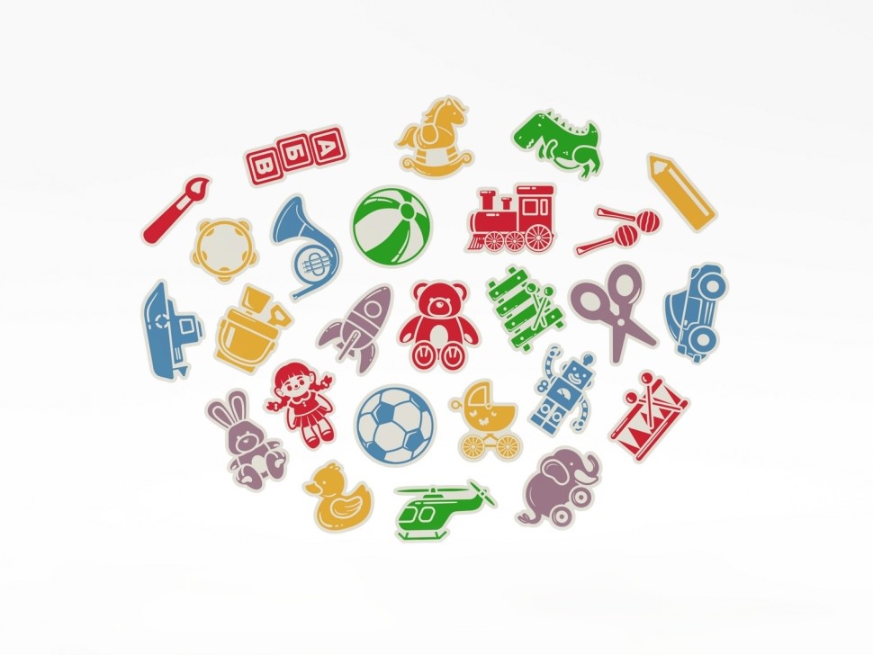 Набор декоративных настенных панелей «Игрушки» с яркими и узнаваемыми изображениями любимых детских предметов. Идеальное решение для оформления игровой комнаты в детском саду, школе, развивающем центре и других образовательных учреждениях.