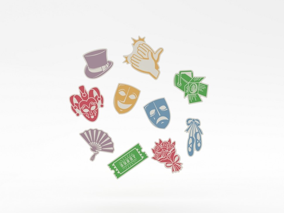 Яркие изображения знакомят детей с основными атрибутами сцены. С их помощью можно быстро преобразить помещение для тематических занятий, праздников и спектаклей.