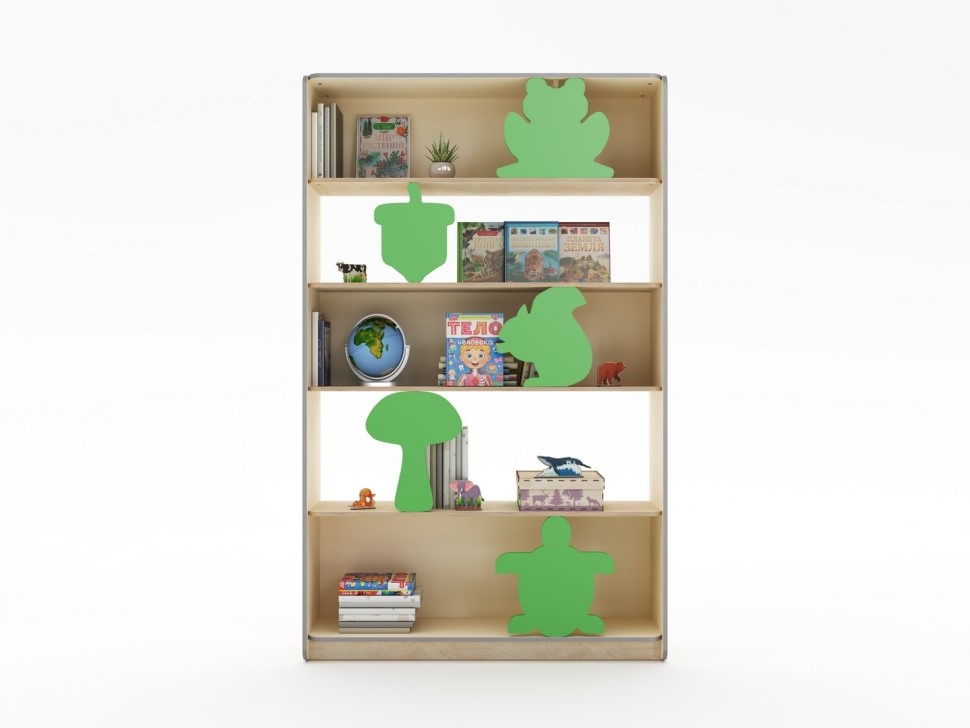 Тематический дизайн: фасад украшен различными изображениями из фанеры — белочки, гриба, черепахи, желудя и лягушки, что пробуждает у детей интерес к природе и создает позитивную эмоциональную среду. Они также могут использоваться педагогами в качестве наглядных пособий во время занятий.Продуманная организация: пять просторных полок, каждая из которых разделена на две секции вертикальной перегородкой, позволяют систематизировать игрушки учебные материалы, книги и другие принадлежности.