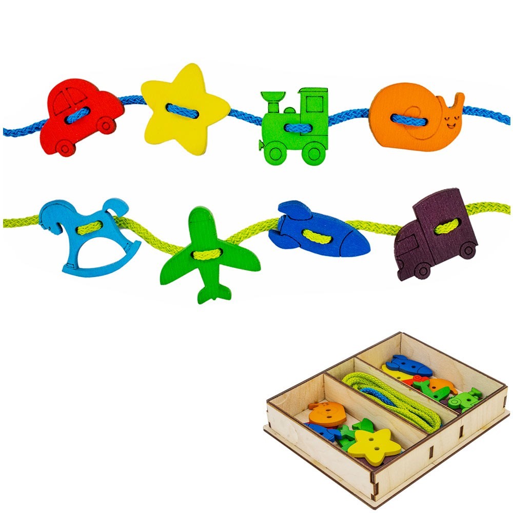 Игра состоит из деревянных фигурок с дырочками, которые необходимо нанизывать на яркий шнурок.
