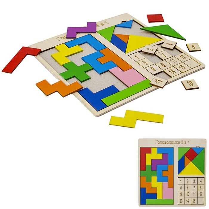 В новой головоломке 3 в 1 от ТМ «АРБО» собраны на одной доске самые известные и интересные логические игры (тетрис, танграм и пятнашки)!