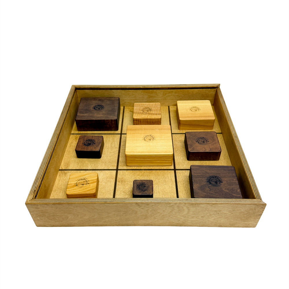 Подготовка: В игре участвуют два игрока. Каждому игроку предоставляется набор деревянных фигур разного размера. Один игрок играет темными фигурами, другой – светлыми. Игровое поле представляет собой стандартную сетку 3 x 3.