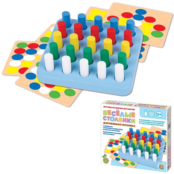 Развивающая деревянная мозаика "Веселые столбики" для малышей от 3 лет. Собирайте рисунки из деревянных столбиков на игровом поле и выполняйте задания на карточках. Во время игры у малыша развивается логическое мышление, фантазия и мелкая моторика. В набор игры входит: деревянные столбики, игровое поле с углублениями и двусторонние карточки-задания.