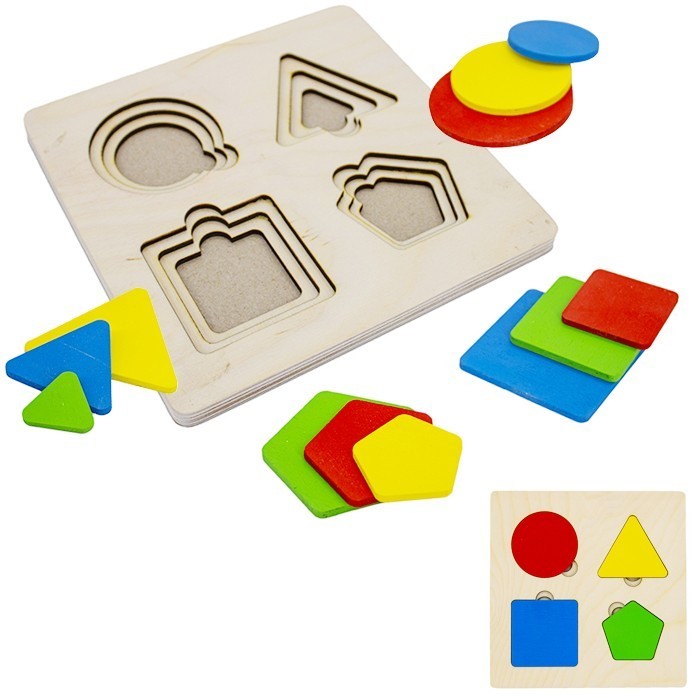Комплектация: деревянная рамка (17,9 х 17,9 х 1 см), 4 фигурки-вкладыша разной геометрической формы