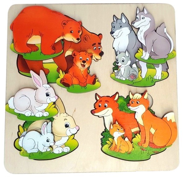 Развивающая доска "Дикие животные" - это полезная и увлекательная игрушка для малышей, которая поможет ребенку получить множество новых знаний. В комплект входит рамка с отверстиями, а также 12 вкладных элементов в виде четырех разных звериных семейств - волков, медведей, лис и зайцев. Каждая семейка состоит из мамы, папы и детеныша - рассматривая фигурки, ребенок познакомится с понятием "большой-средний-маленький", узнает название и внешний вид животных, потренирует навыки логики, зрительного восприятия, мелкой моторики и сообразительность. Все элементы изделия выполнены из экологически чистого материала - дерева, хорошо отшлифованы и окрашены безопасными нетоксичными красками.