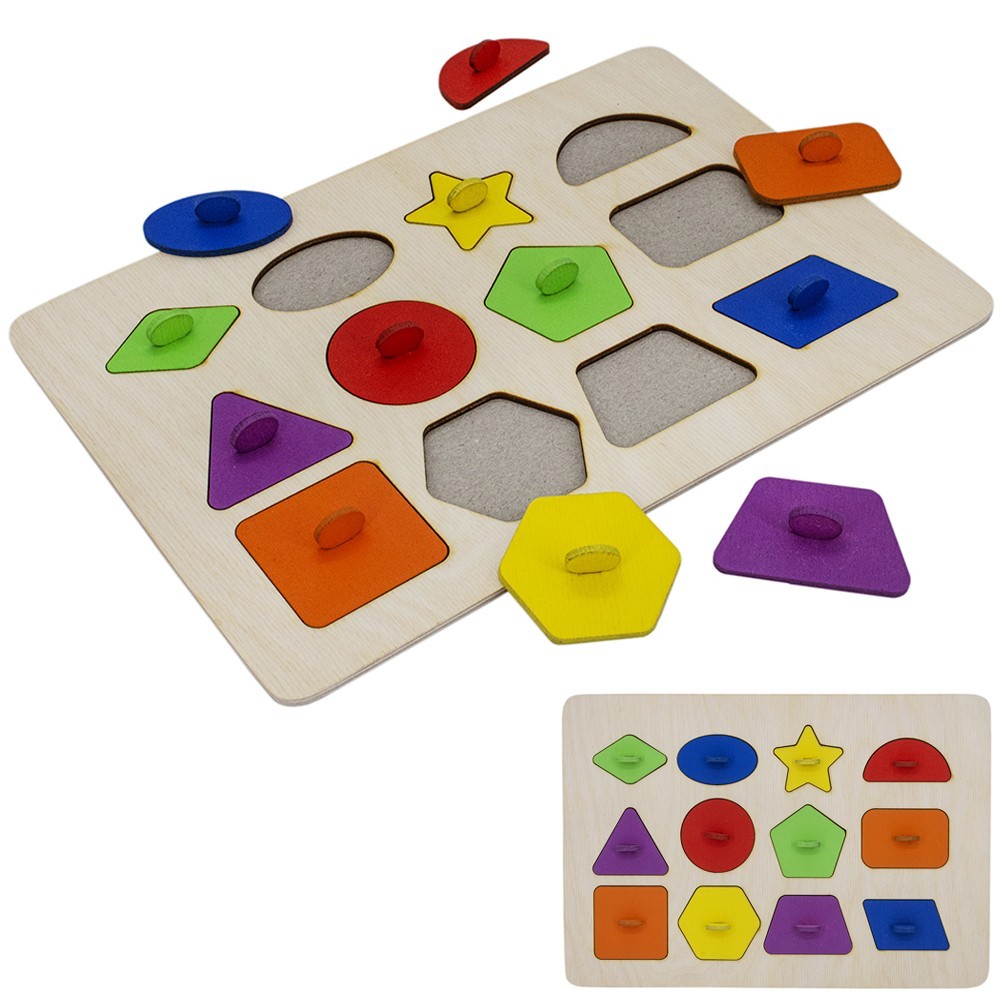 Игрушка представляет собой деревянную рамку-вкладыш и 12 разноцветных геометрических фигур с удобными держателями.