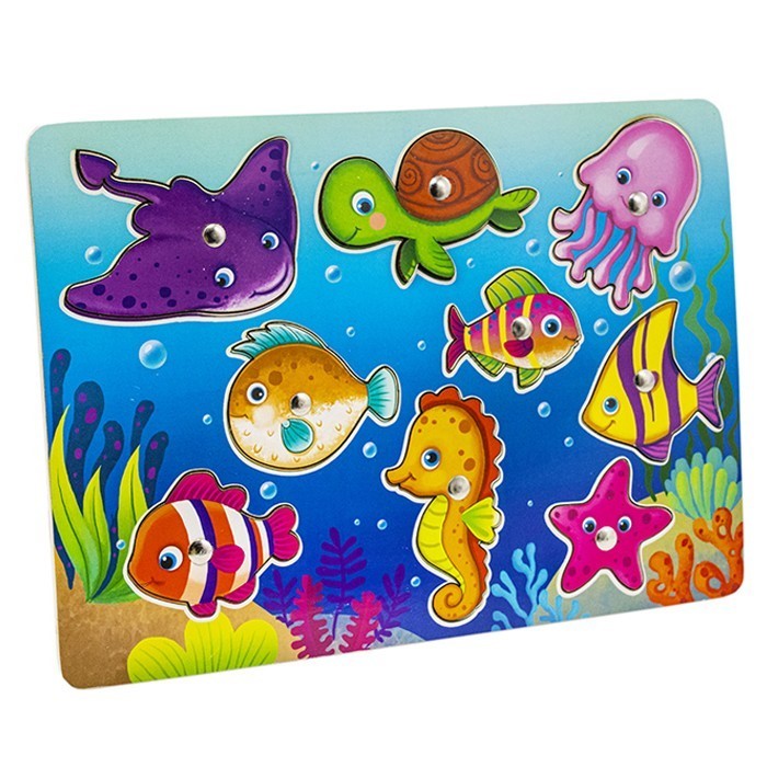 Задача ребенка – с помощью магнитной удочки выудить с деревянного вкладыша морских обитателей.