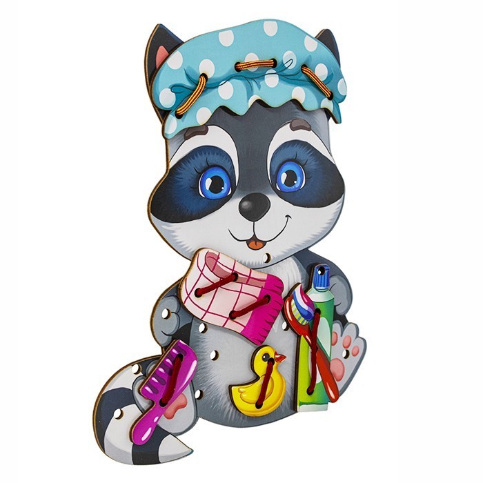 Комплектация: деревянная основа в виде енота (23,5 х 19 х 0,5 см), деревянные детали для шнурования – 4 шт., шнурок – 1 шт.