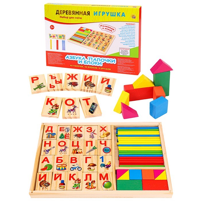 Деревянная Учим буквы. АЗБУКА, ПАЛОЧКИ И БЛОКИ 40 пал,40 блок с карт,8 брус ИД-3790