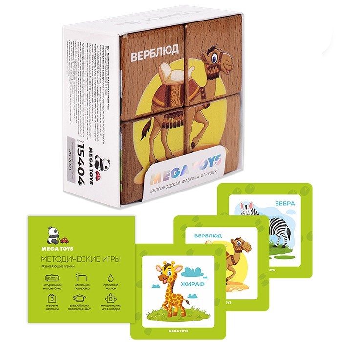 Деревянные Кубики 4 шт Животные жарких стран (4кубика, 3 двусторонние карточки, развивающее методическое пособие) 15404