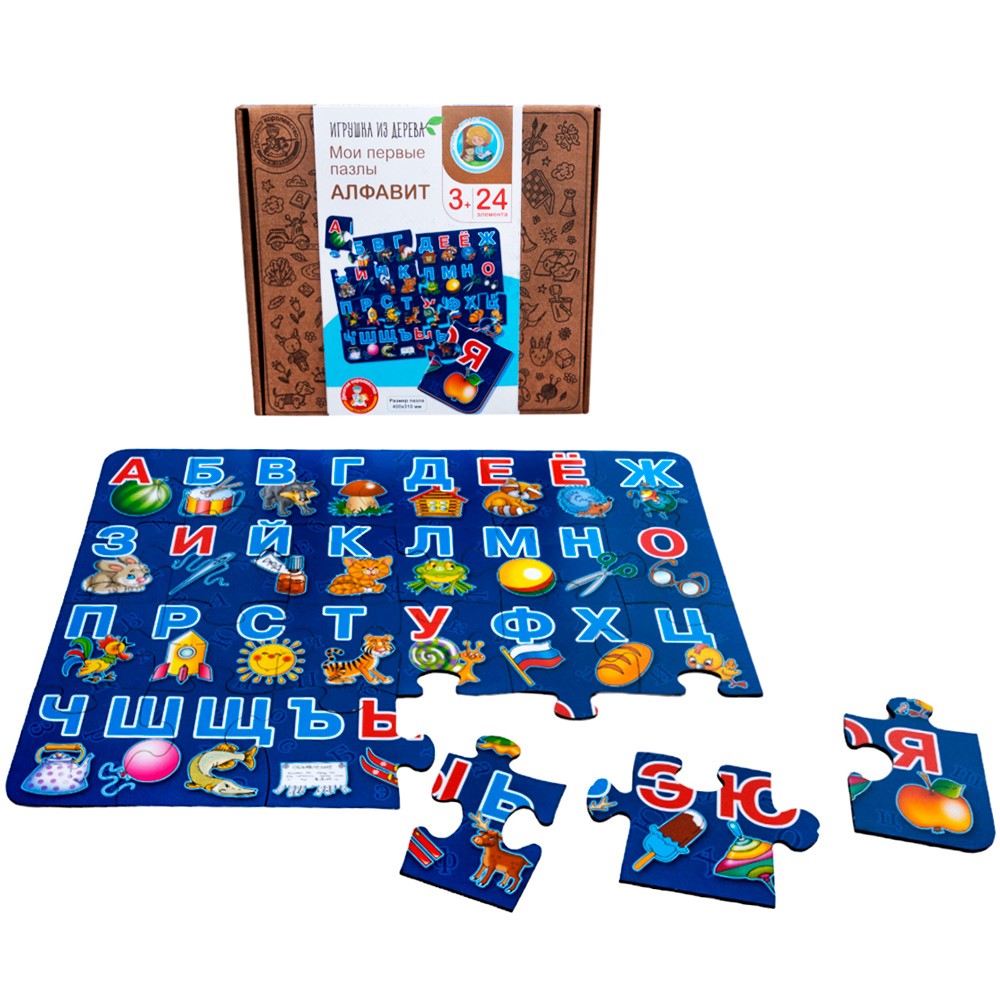 Изучайте русский алфавит в игровой форме, собирая пазлы из дерева «Алфавит». Яркие картинки превратят обучение в веселую игру!