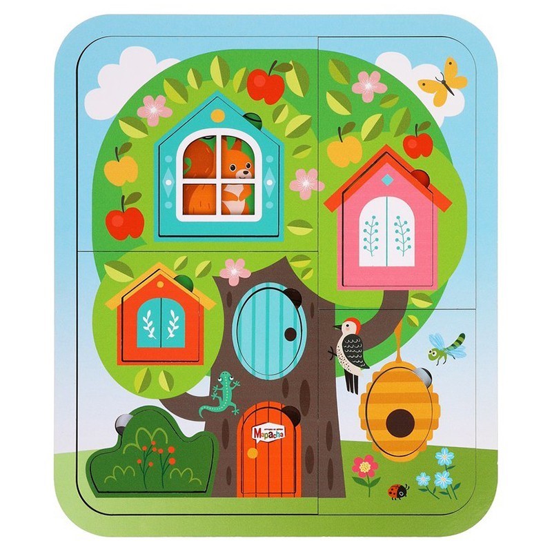 - многослойный деревянный пазл: части дерева, окошки, животные;