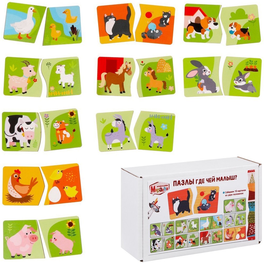 Деревянный Пазл-половинки. Домашние животные. Где чей малыш?, 10 шт. в наб., разный рез 962516