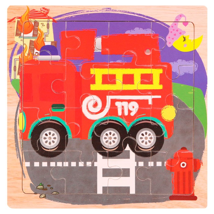 Деревянный Пазл рамка Пожарная машинка 16 элементов 14,5х14,5 см ИД-0132