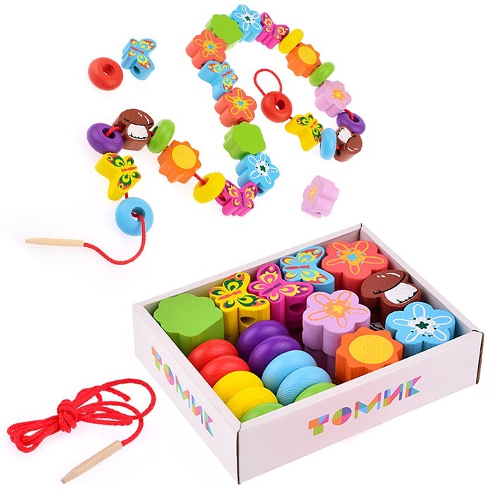 • Как играть: нанизывать бусины на шнурок. Можно составлятьлогические цепочки.
