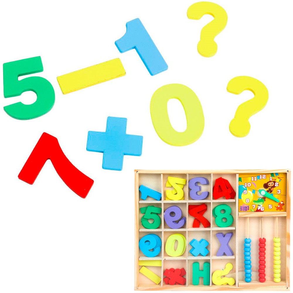 Комплектация: деревянные цифры и знаки, деревянные счёты с бусинами 3-х цветов, часы