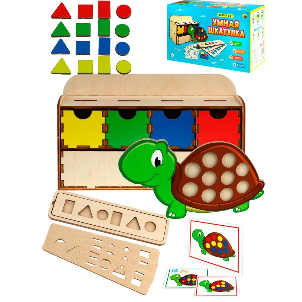 Комплектация: комодик-сортер, черепашка-сортер, линейка-сортер, двусторонние карточки (8 шт.), фишки