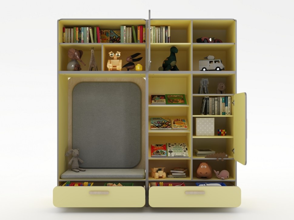 Во втором варианте зона отдыха находится справа. В этой модели используются закрытые полки с дверцами, которые позволяют хранить предметы скрыто от детей, сохраняя аккуратный вид и защищая содержимое от пыли. Блок хранения располагается слева.