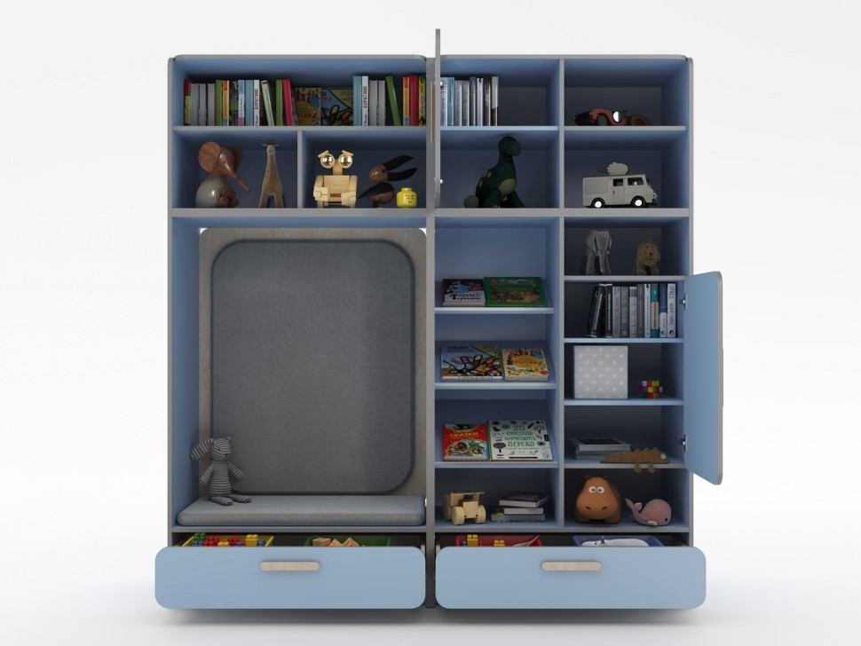 Во втором варианте зона отдыха находится справа. В этой модели используются закрытые полки с дверцами, которые позволяют хранить предметы скрыто от детей, сохраняя аккуратный вид и защищая содержимое от пыли. Блок хранения располагается слева.