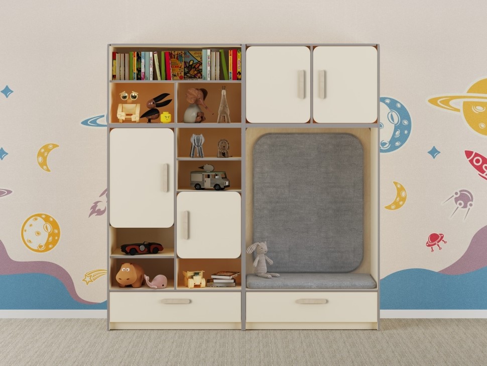 Во втором варианте зона отдыха находится справа. В этой модели используются закрытые полки с дверцами, которые позволяют хранить предметы скрыто от детей, сохраняя аккуратный вид и защищая содержимое от пыли. Блок хранения располагается слева.